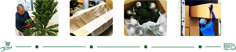 オーナメントが全てついている状態でお届致します。返却もそのまま箱に入れるだけ!商品と一緒に御請求書を同封させて頂きます。なお、発送は140cm、180cm、240cmのツリーのみとなります。
